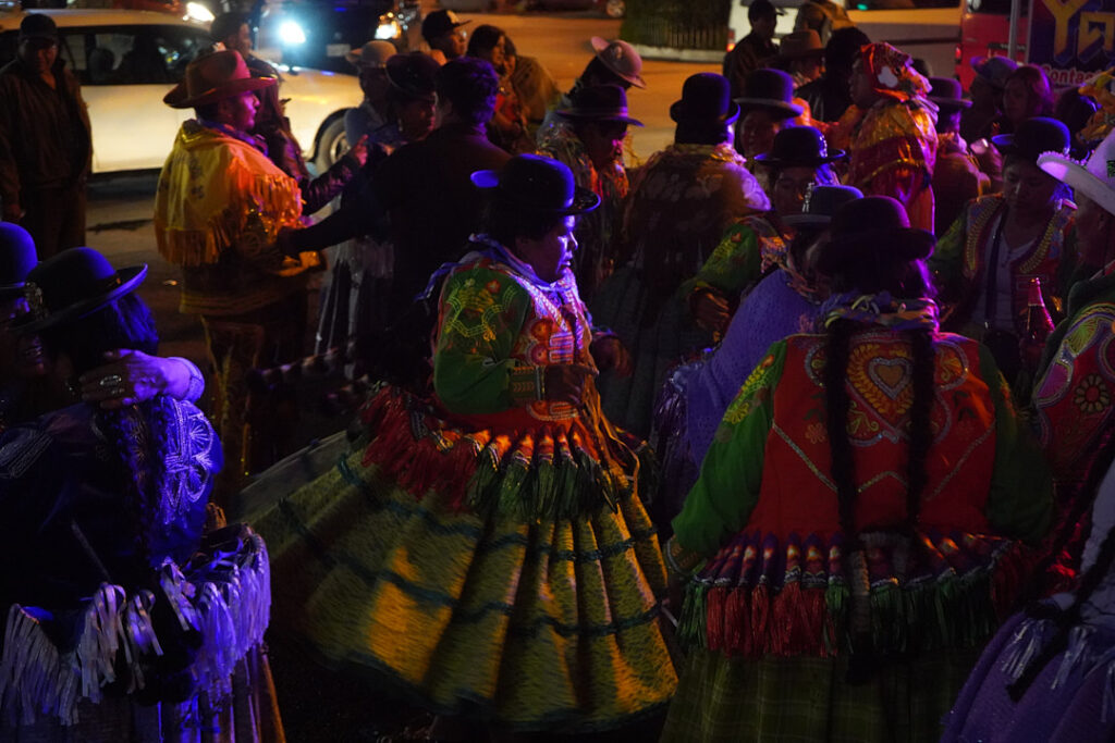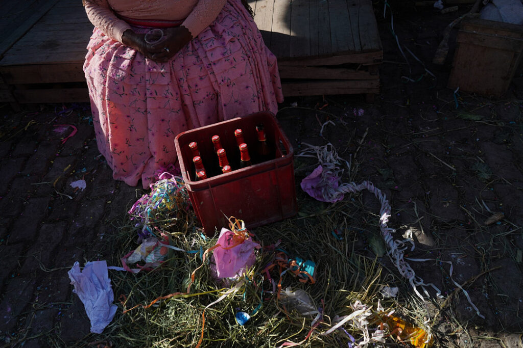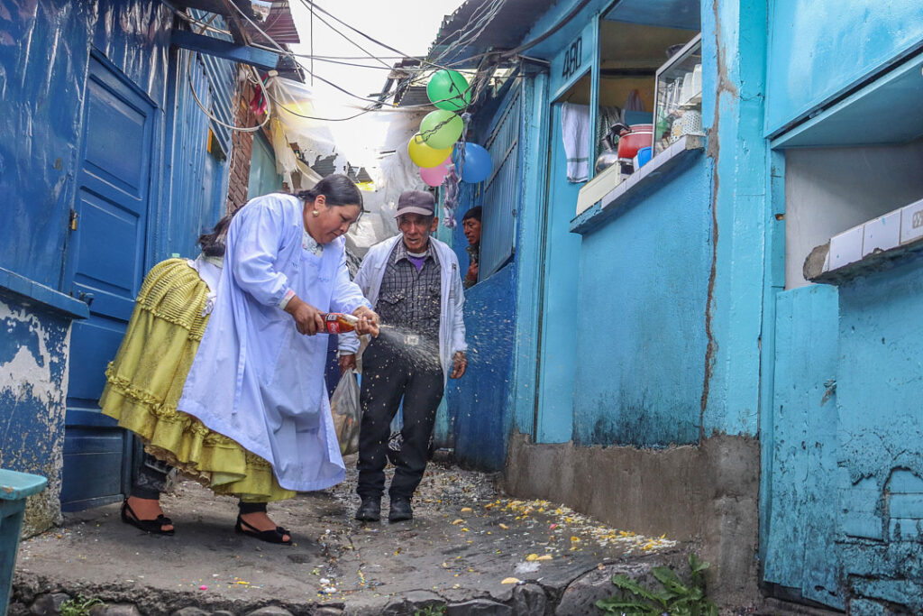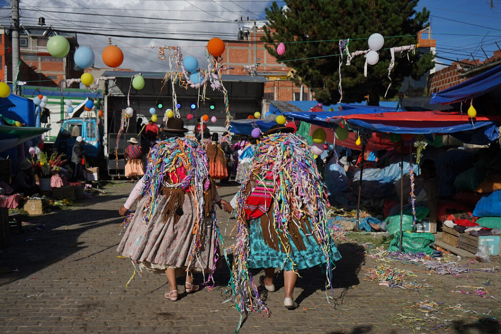 En la ciudad, la challa se transforma en pertenencia y prosperidad. Casas, negocios y automóviles se adornan con serpentinas y confites, mientras el alcohol se rocía en las esquinas como gesto de protección. En mercados como Villa Dolores, las comerciantes aymaras convierten el espacio cotidiano en escenario ritual: agradecen por el sustento y piden prosperidad. Lo económico y lo espiritual se cruzan en un mismo territorio.
