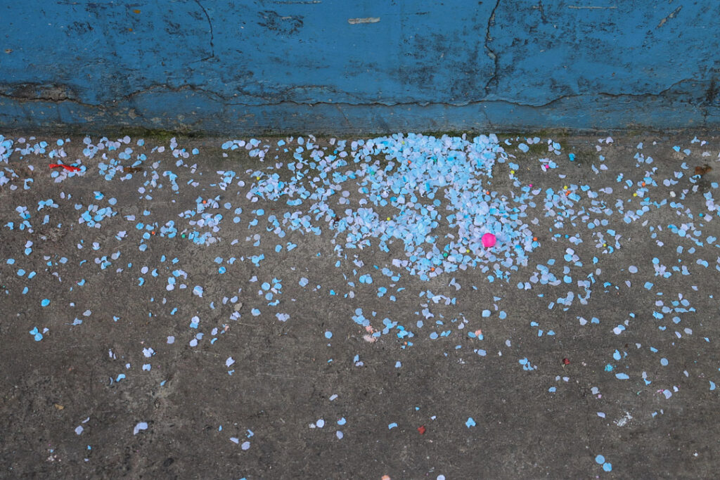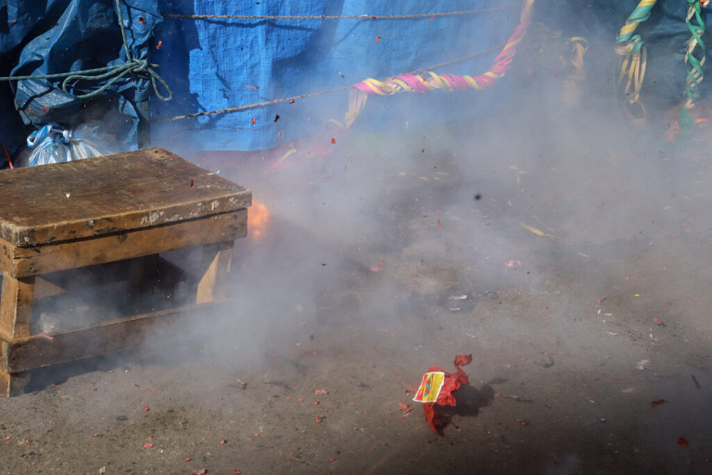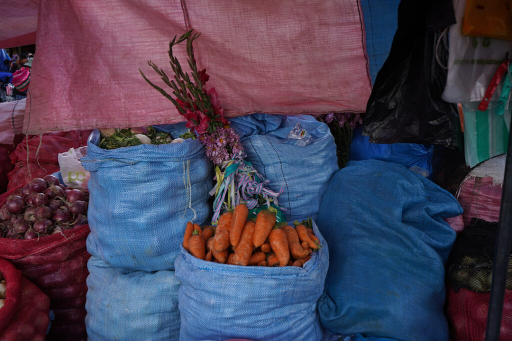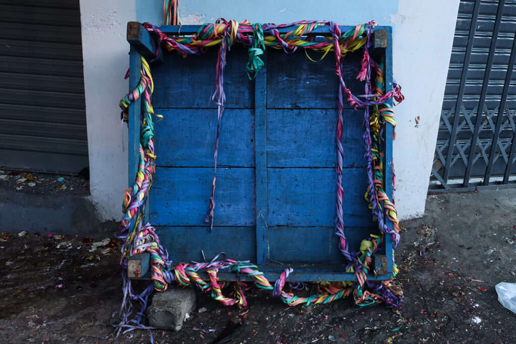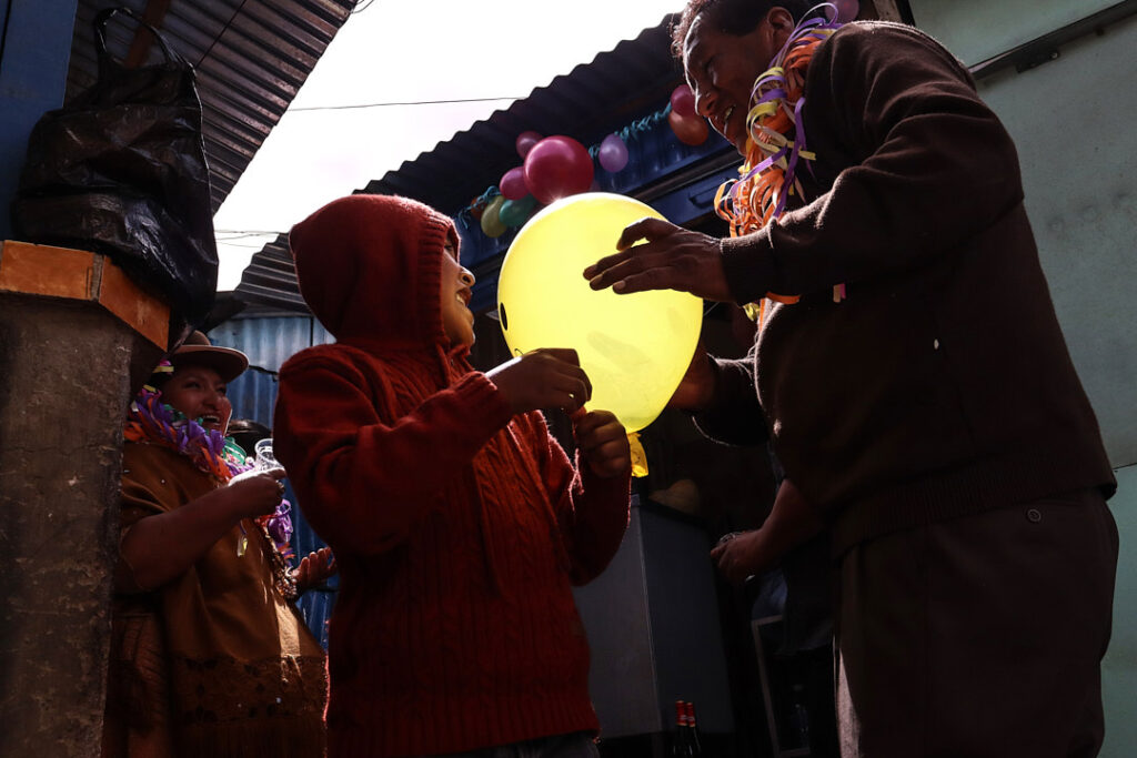 En la ciudad, la challa se transforma en pertenencia y prosperidad. Casas, negocios y automóviles se adornan con serpentinas y confites, mientras el alcohol se rocía en las esquinas como gesto de protección. En mercados como Villa Dolores, las comerciantes aymaras convierten el espacio cotidiano en escenario ritual: agradecen por el sustento y piden prosperidad. Lo económico y lo espiritual se cruzan en un mismo territorio.